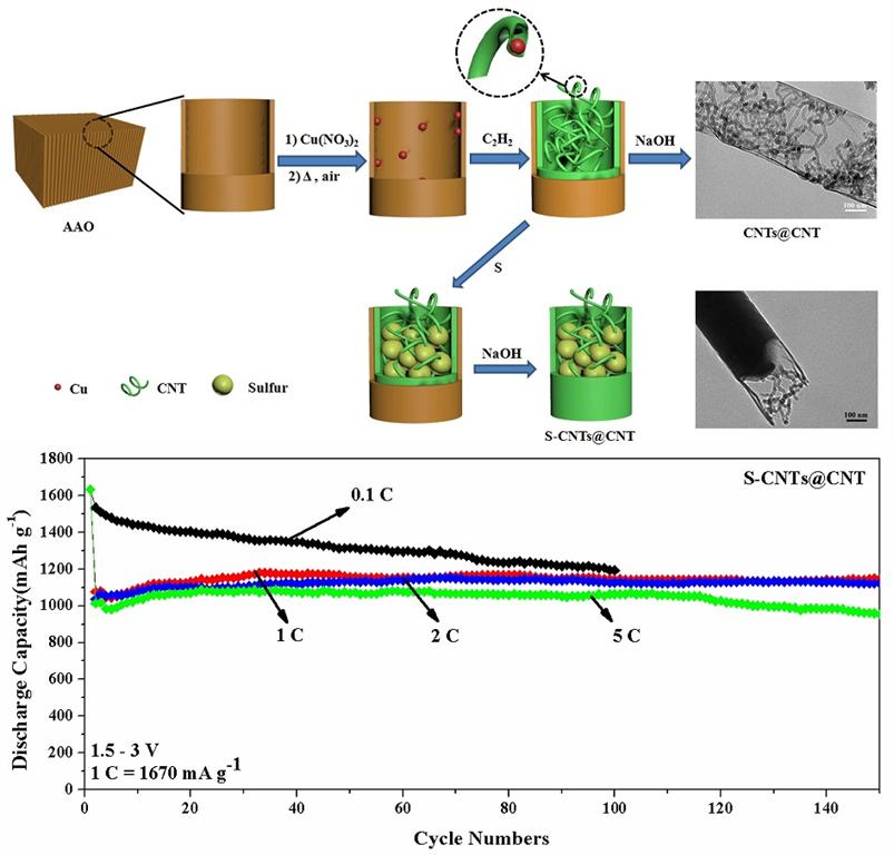 1)锂离子电池用硫基正极材料的理论比容量可达1672 mAh/g,是商业使用的正极材料的10倍以上,锂硫电池的理论比能量更是高达2500 Wh/kg,开发高性能的锂硫电池成为当今锂电池研究中的热点,国产亚洲精品美女久久久环境与化学工程学院化工系王勇教授课题组经过深入研究发现:使用碳纳米管包覆硫材料的复合正极材料的可逆储锂容量可以达到1633 mAh/g,非常接近其理论值,同时该正极材料在大电流下也具有非常稳定的储锂性能。该研究成果以上大为第一单位发表在Nano Letters 论文(影响因子为13.6),第一作者为研究生金菲英同学。