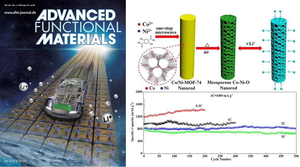 2)过渡金属氧化物作为锂离子电池的负极材料表现出很高的理论储锂容量,然而它们的循环稳定性和倍率性能差,制约了其实际应用。王勇教授和孙炜伟讲师课题组对这一问题展开了深入的研究工作,以双金属有机骨架为前驱体设计得到了一种具有一维介孔纳米棒结构的三元金属氧化物电极材料,用于锂离子电池的负极,表现出很高的容量和优异的循环及倍率性能。该研究成果以上大为第一单位,以内封面论文的形式发表于学术期刊Advanced Functional Materials(影响因子为11.8)上,并得到Wiley材料中国网站的专题报道,该论文的第一作者是研究生李浩同学。